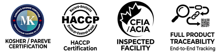Our production facility in Baie-d’Urfé, Quebec is CFIA inspected, HACCP certified, and produces all products under Kosher (Pareve) certification. We maintain full product traceability from production through delivery, and conduct ongoing third-party audits to ensure our food safety standards remain at the highest level in the industry.