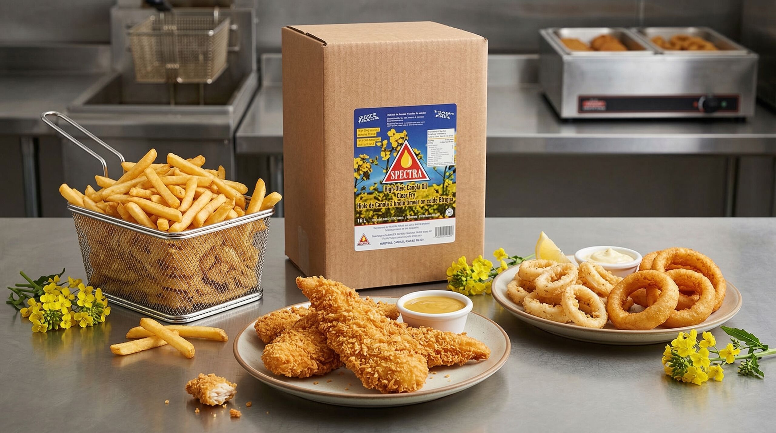 Spectra® Clear Fry is formulated from 100% high-oleic canola and represents the highest-performance non-hydrogenated frying oil in our lineup. It is designed specifically for operations where oil endurance is critical, high-throughput fryers running multiple shifts, operations that have eliminated trans fats, and establishments demanding the cleanest-tasting fried food possible.